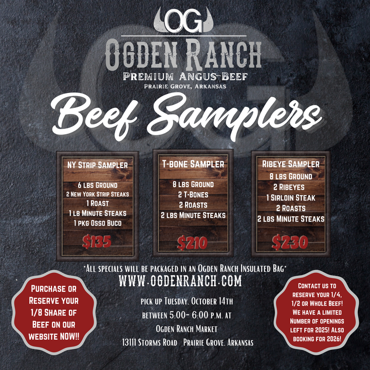 We sell high quality Angus beef directly off of our farm. All of our beef is USDA inspected and dry aged for 14-21 days before processing. We pride ourselves in the fact that people know where their beef comes from when they buy from Ogden Ranch. They know they are getting a high quality product, an animal that was ethically and responsibly cared for right here on our farm. Our animals are grass fed and finished on grain, with no added hormones which makes for an unbelievable marbling and taste! We currently sell to customers all over the state of Arkansas, Oklahoma, Missouri and as far away as Colorado. We sell by the quarter, half, or whole, as well as our sampler packages and ground beef . Available for local pickup only.